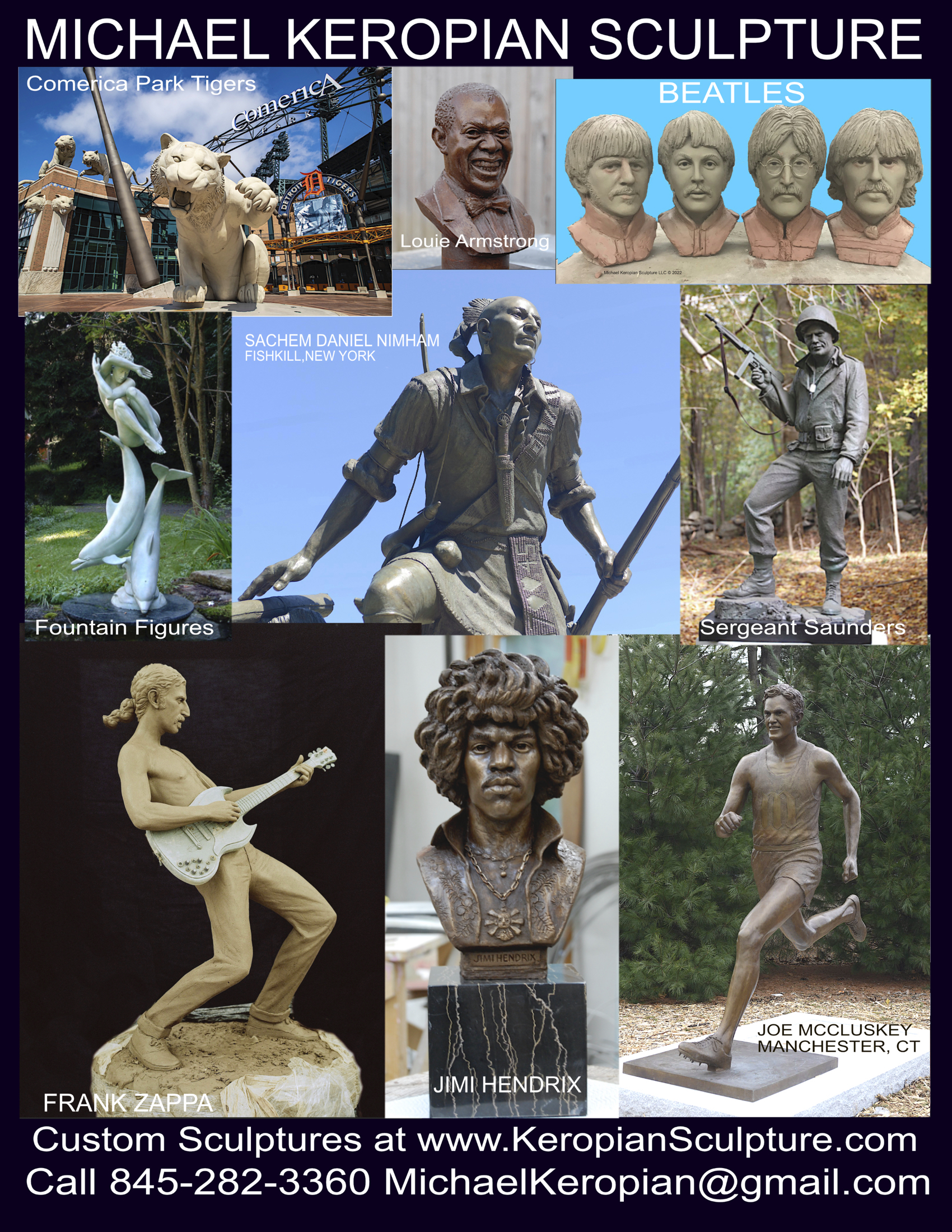 Michael Keropian creates and designs historical statuary at any size for the private collector, veteran's committees, designers and architects. He specializes in historically accurate depictions of his subjects. He applies his fond interest for history and in many cases works with local historians and scholars in order to bring about the best results.